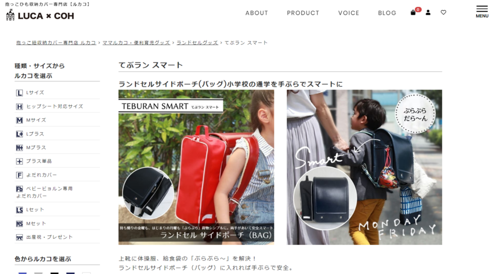 高学年生でも使えるようにスタイルや幼稚っぽさを無くした結果、この形になりました。「てぶラン」は、片側にも両側にも対応できます。